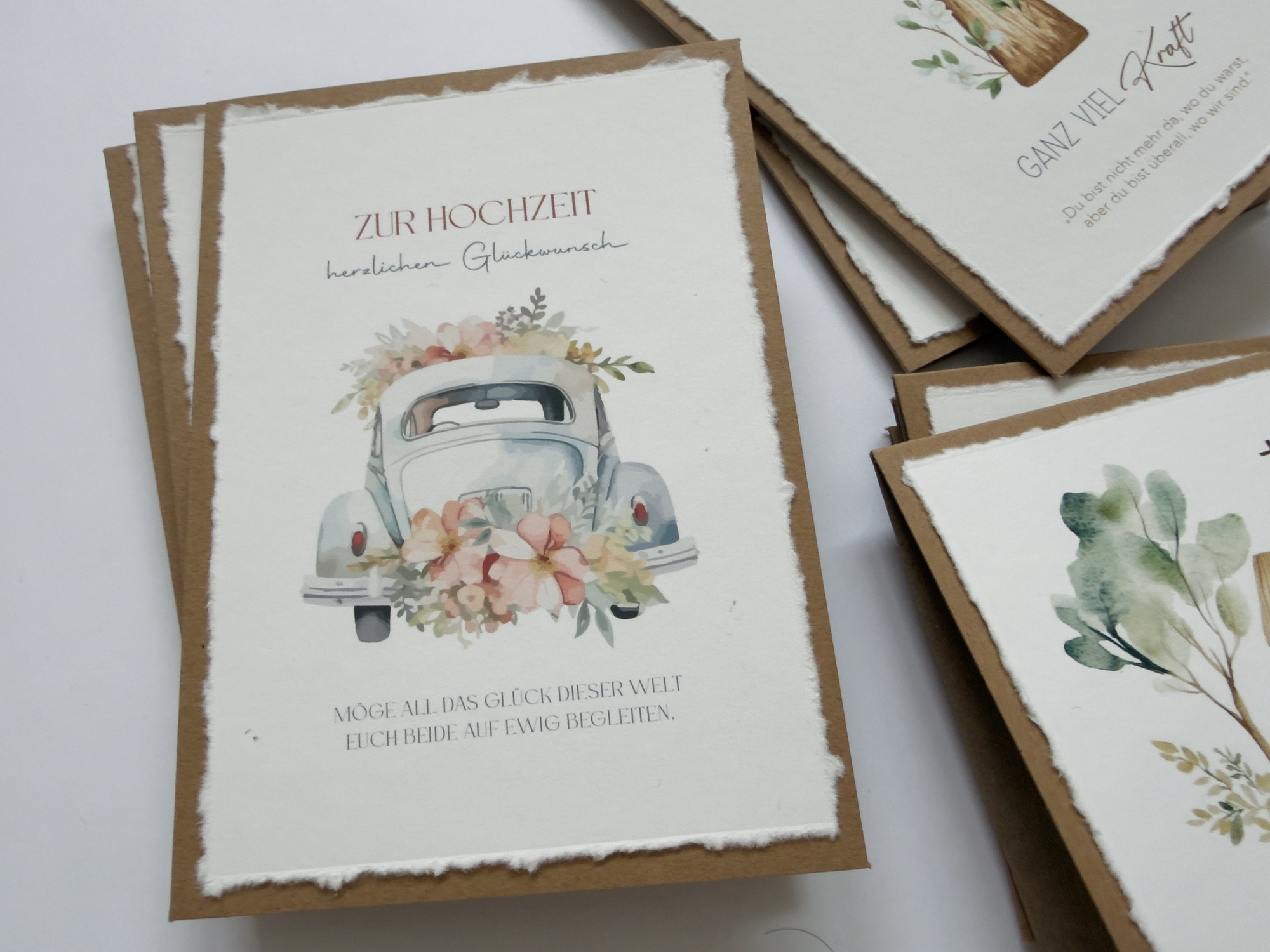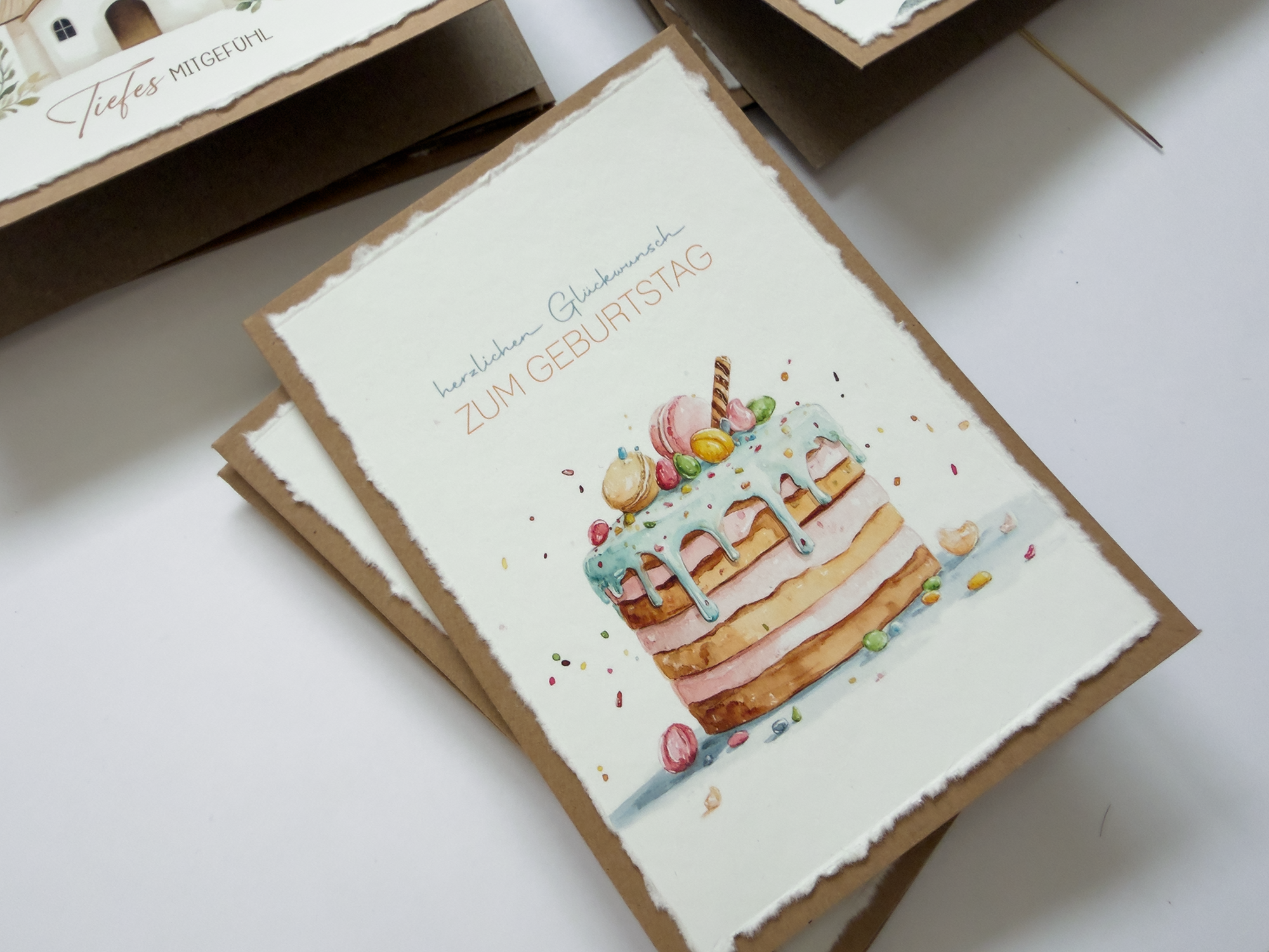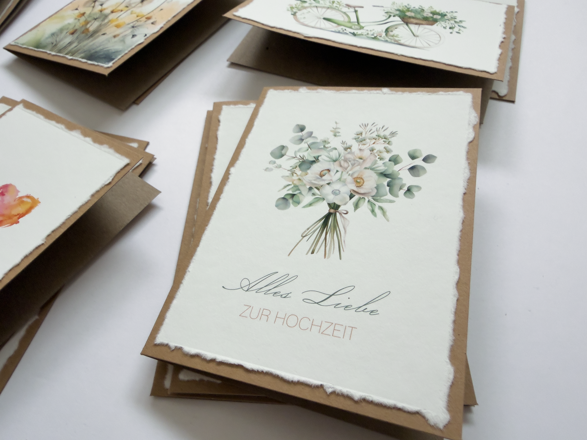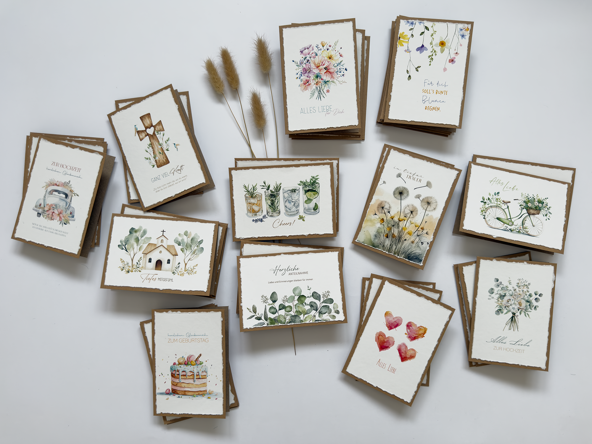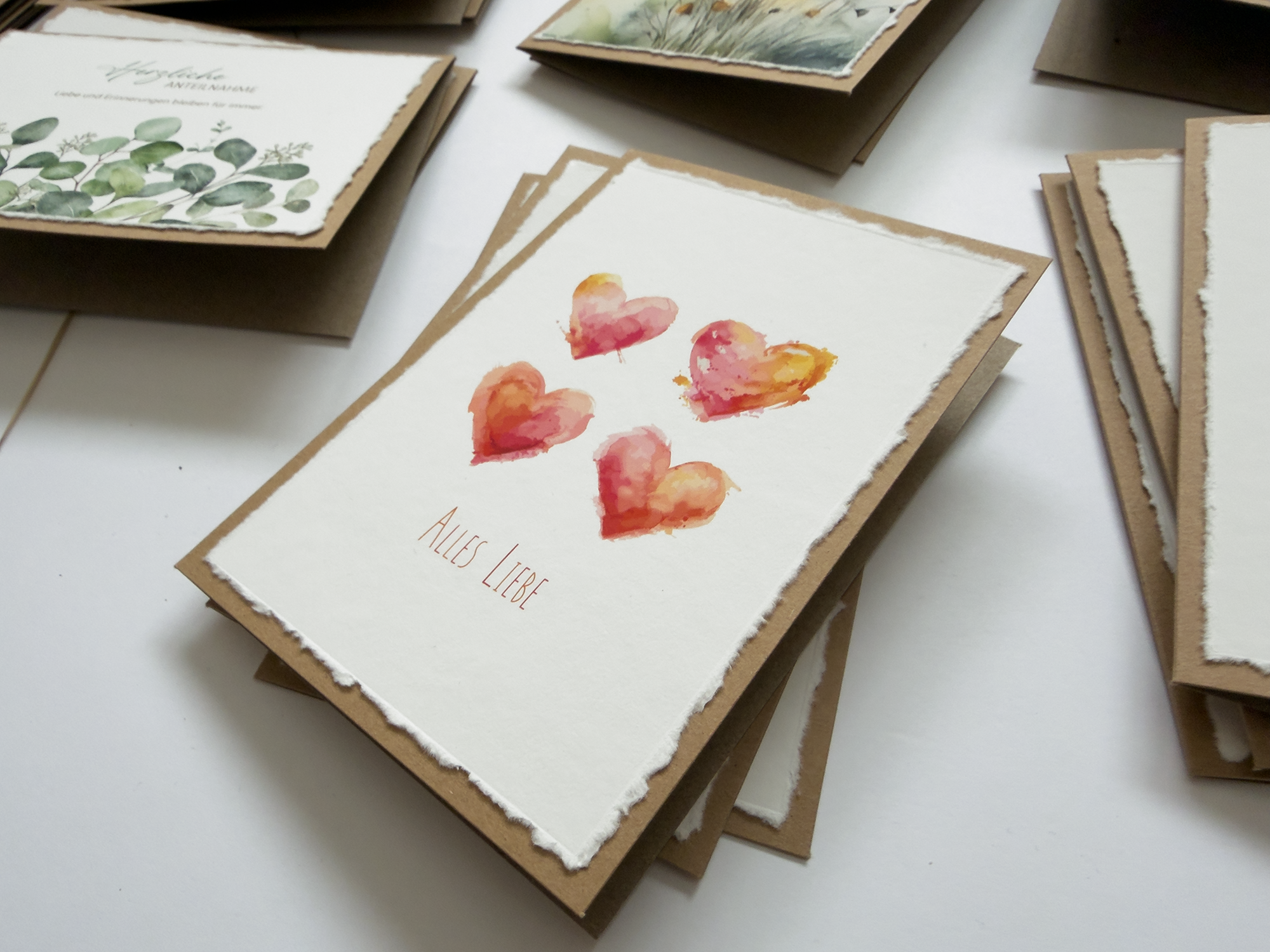 Ein Ăberblick ĂŒber mein Papeterie-Stil: handgemachte Karten, Aquarellillustrationen und liebevolle Details auf Naturpapier.