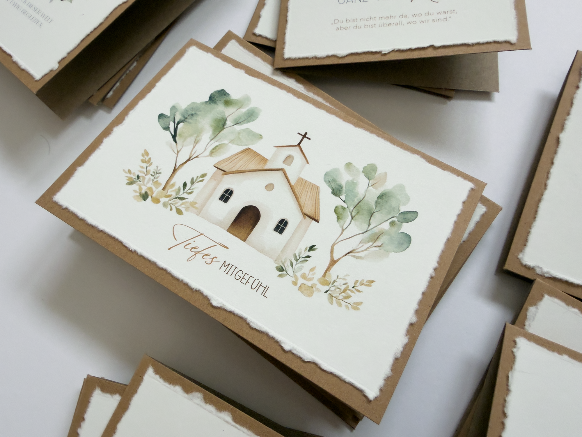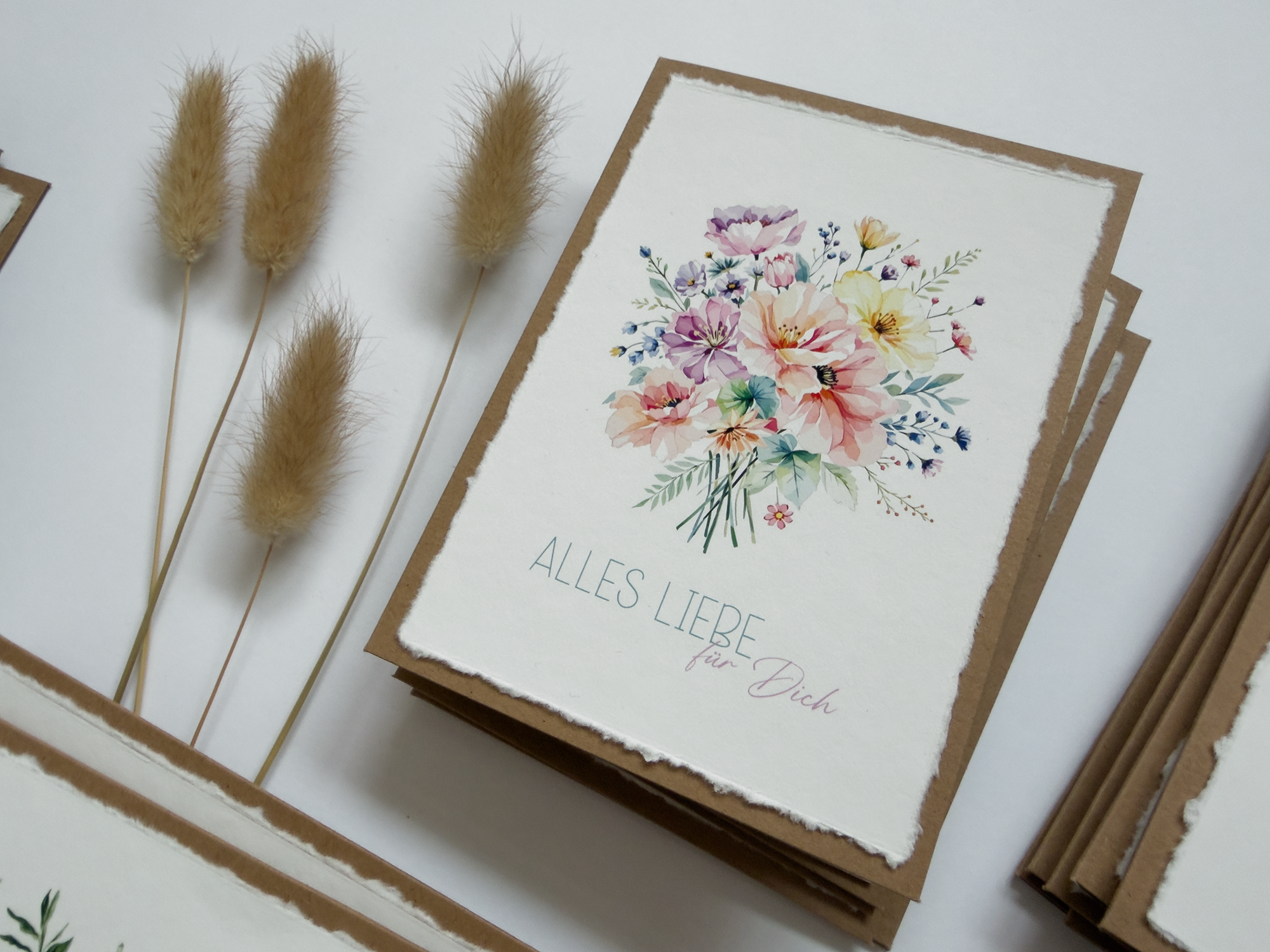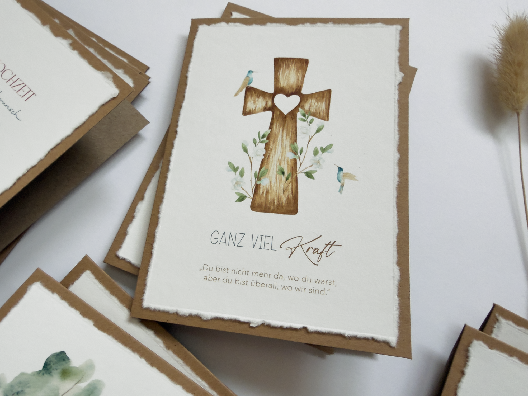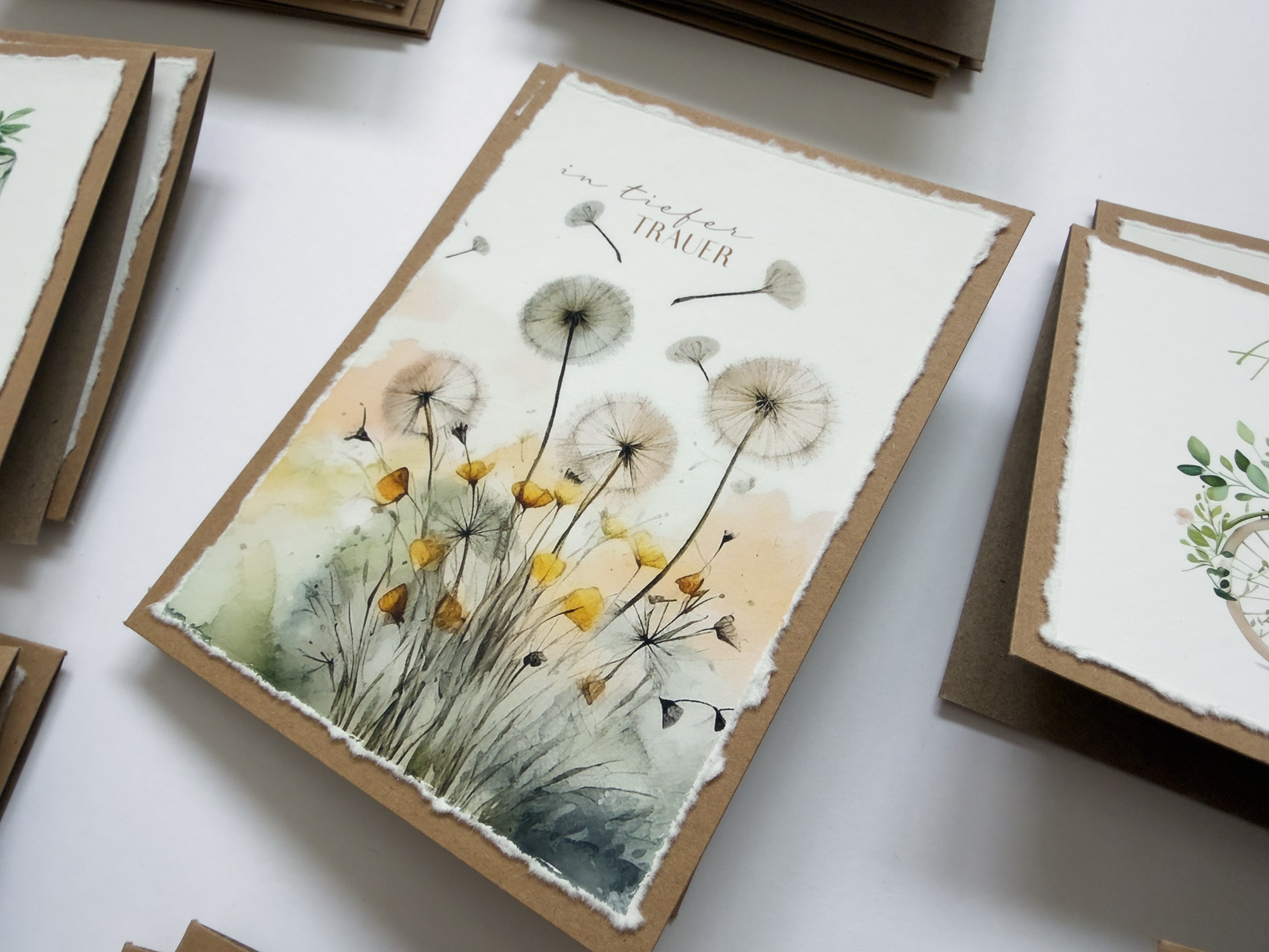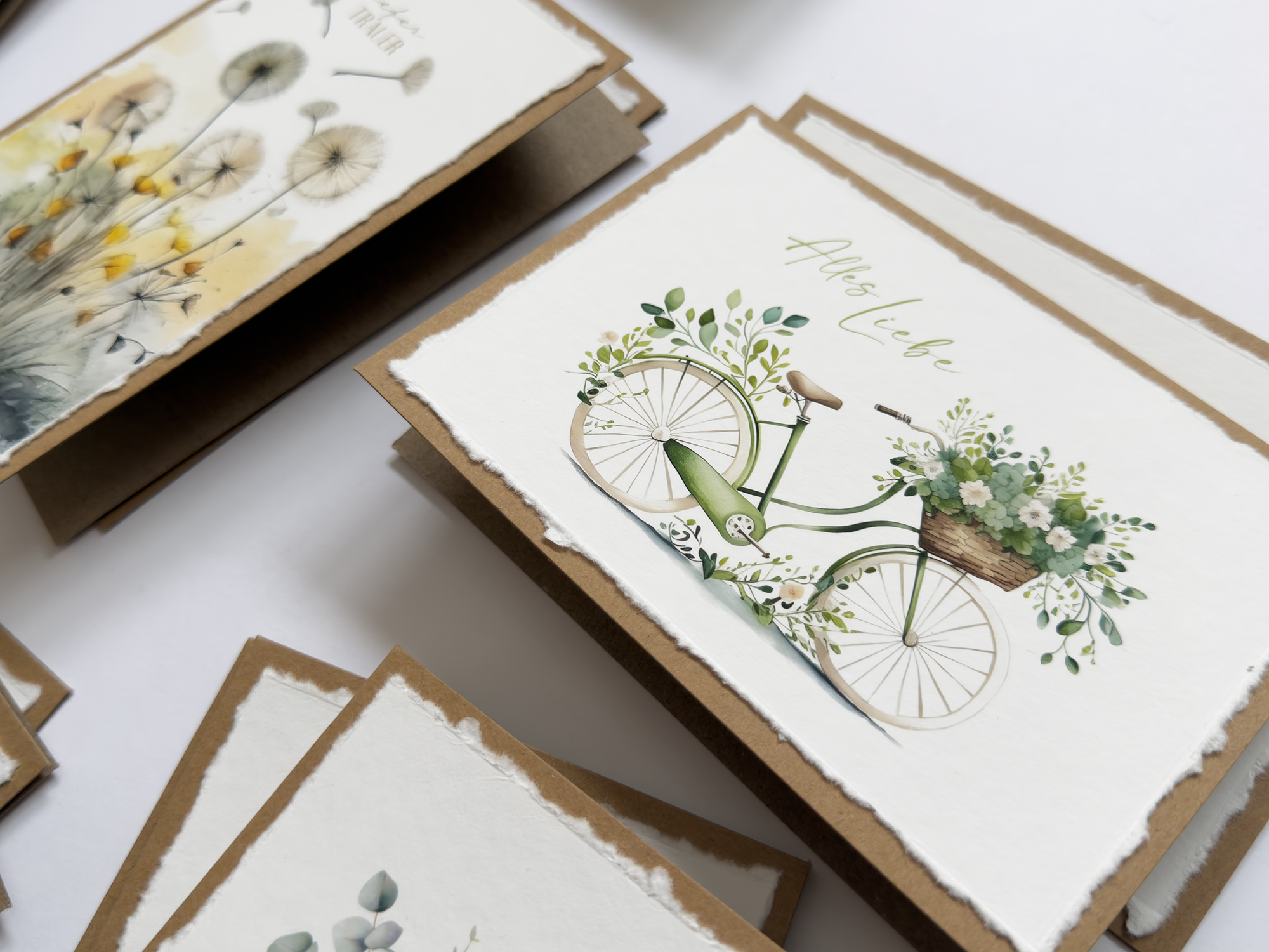 Ein Ăberblick ĂŒber mein Papeterie-Stil: handgemachte Karten, Aquarellillustrationen und liebevolle Details auf Naturpapier.